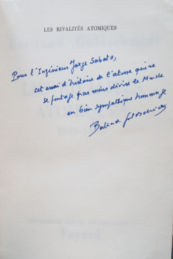 El texto posee dedicatoria del autor Bertrand Goldschmidt para Jorge Sabato; además, contiene marcas en los márgenes y en el cuerpo del texto de Jorge Sabato.